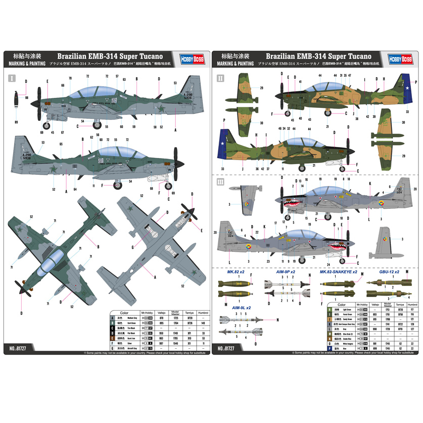 Brazilian EMB-314 Super Tucano marca Hobby Boss escala 1/48. Incluye partes en photo etched y decals para tres esquemas diferentes. (Fuerza aérea bracileña, colombiana y chilena)