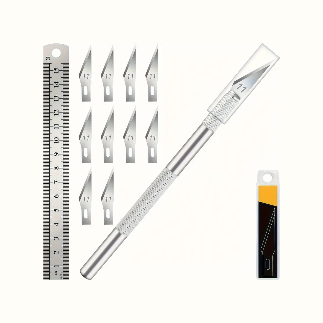 Set de mango de cuchilla tipo X-Acto para cuchilla No.11. Incluye repuesto de 10 cuchillas y regla de metal.